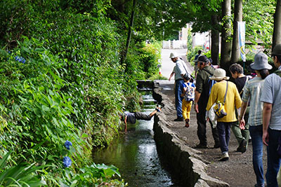 その後、国分寺跡の方に散策。道すがら、ヤグルマギクをみたりしながら歩きましたが、尾張藩が鷹狩りをしたという「お鷹の道」を歩きました。ここは綺麗な水が流れているところで、蛍もでるそうです。この日はとても暑かったので、風が吹くと、この川もの涼しさと同時に、ひとときの涼を楽しみました。