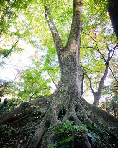 最初に伺ったの、和田堀稲荷神社。ここには、都内でも有数のシラカシがあります。樹高18m。幹回り3.8m。どんぐりを探しましたが、この時期にはもうありませんでした。