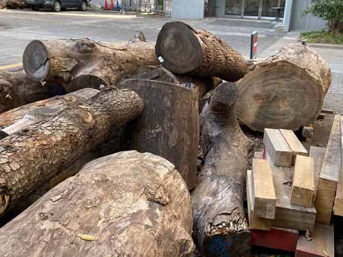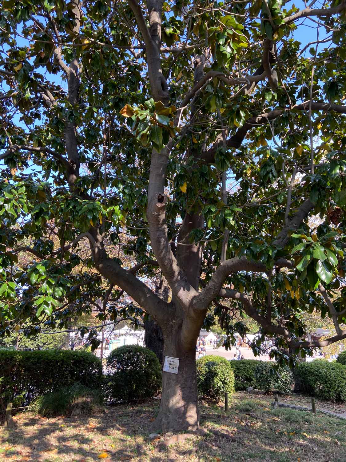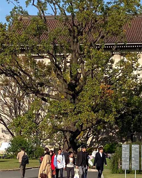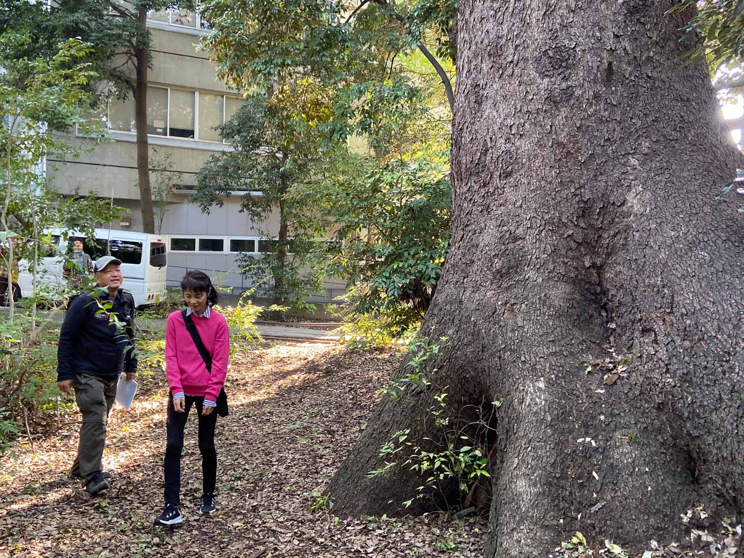 その後は上野公園を横断する形で東京芸大の構内へ。ここで最初に見たのはスタジイのかなりの老木。こんなになっても生きているのかと思われるほど、幹の一部しか残っていないのに、立派に葉っぱをつけていて生命力に感動しました。すぐ裏にはこの日最大のクスノキの巨樹がありました。芸大の中にはいろんな種類の木がたくさん植えられていると聞きました。