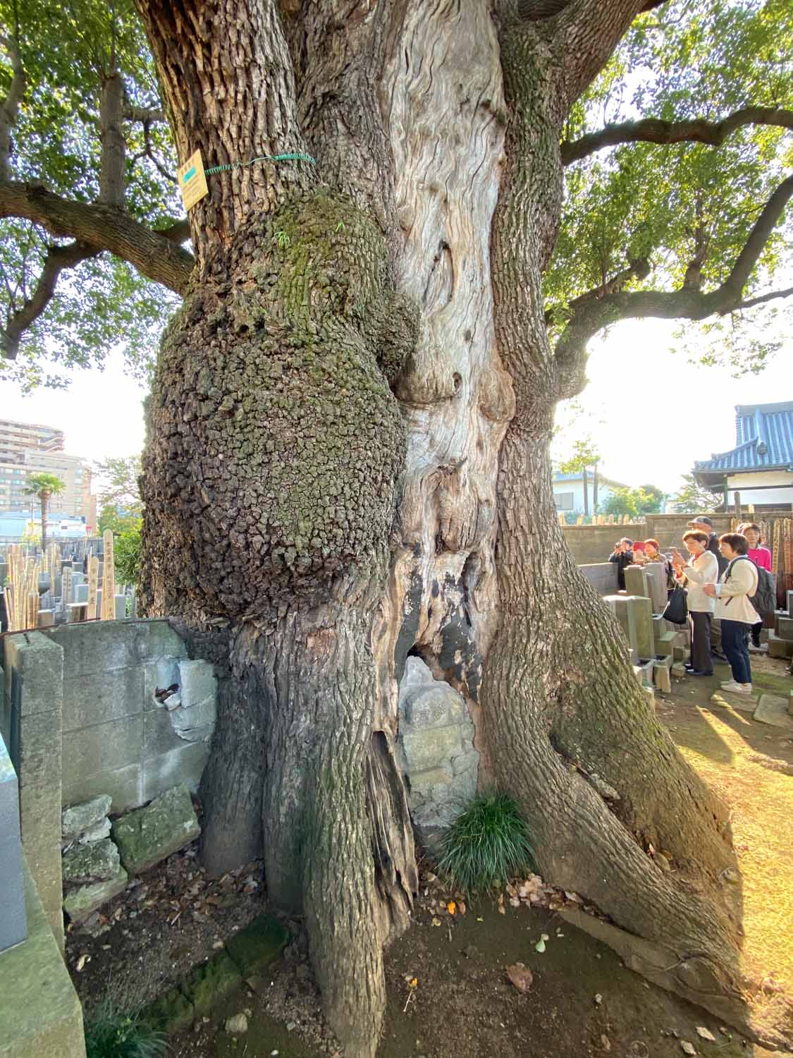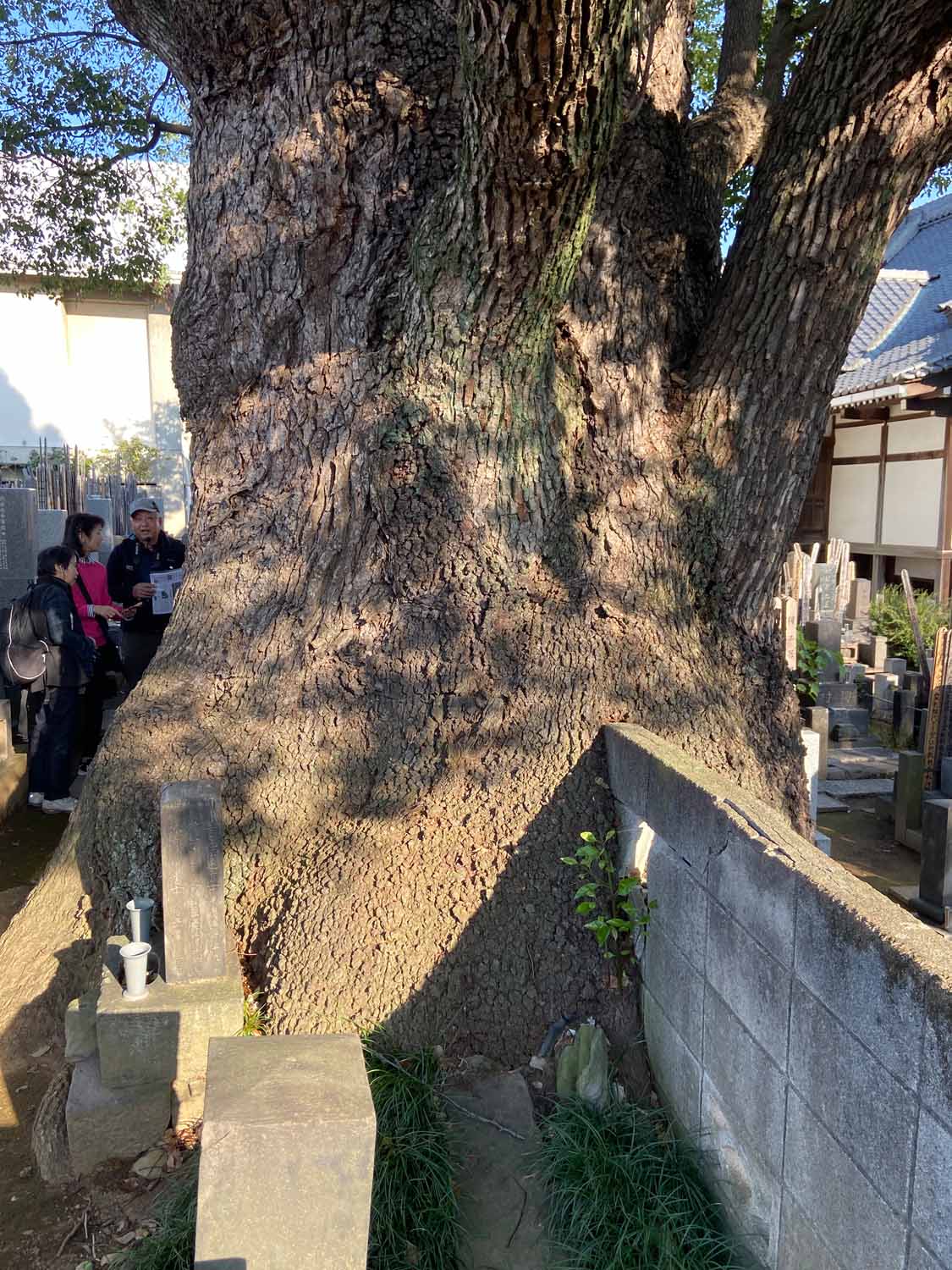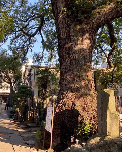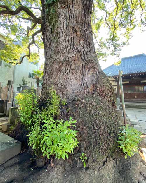 そして、谷中で有名なみかどパン店さんのヒマラヤスギへ。残念ながら台風19号で大きな枝が折れてしまっていました。谷中からは千駄木を目指しながらお寺を巡って、クスノキの大木を何本か訪ねました。大雄寺のクスノキは野生的で、妙雲寺と感應寺の境に立つ塀を飲み込んだクスノキはとても迫力がありました。
