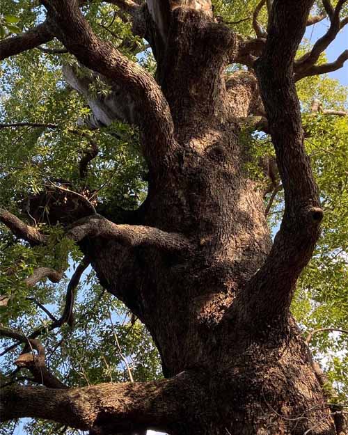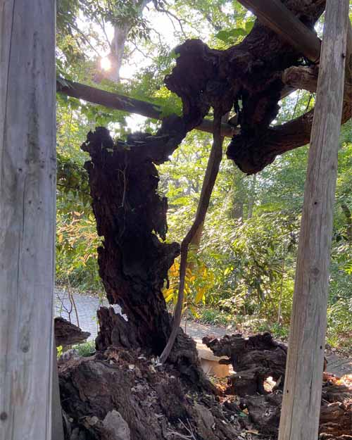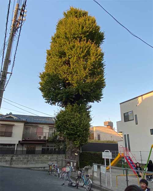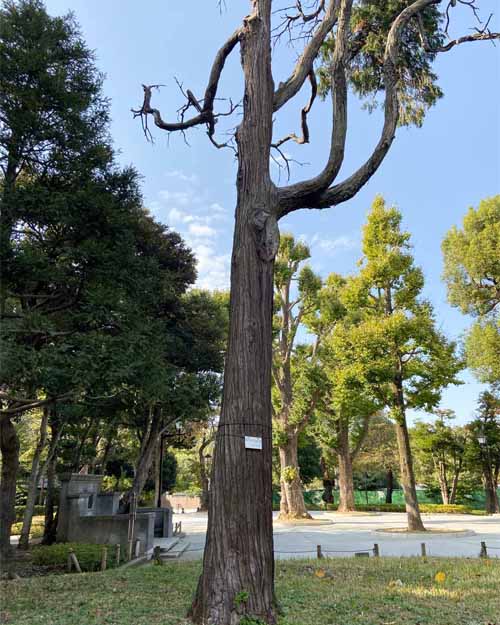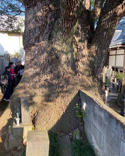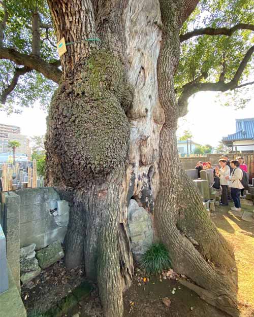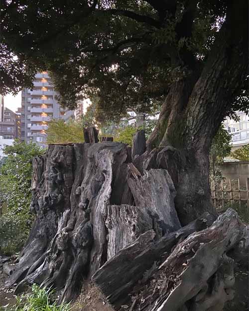 千駄木では、江戸時代の大給藩松平家の屋敷内にあったイチョウを見学。いまは子供たちが集う小さな公園になっているため、とても刈り込まれていてちょっとかわいそうでした。途中、旧森鴎外邸の庭を眺めて最後は、栄松院のスタジイへ。この木は東京大空襲で被弾しほとんど部分がなくなっていました。それでも一部から細い新しい幹が生えて、たくさんの緑をつけていました。木は動けないからトラブルも甘んじて受けなくてはなりませんが、それでも黙々として生を続けようとする。木はその存在そのもので、人間の私たちに多くを教えてくれているような気がしました。