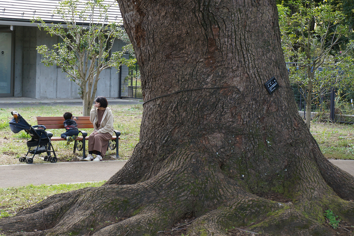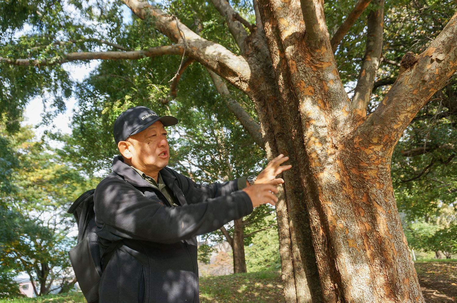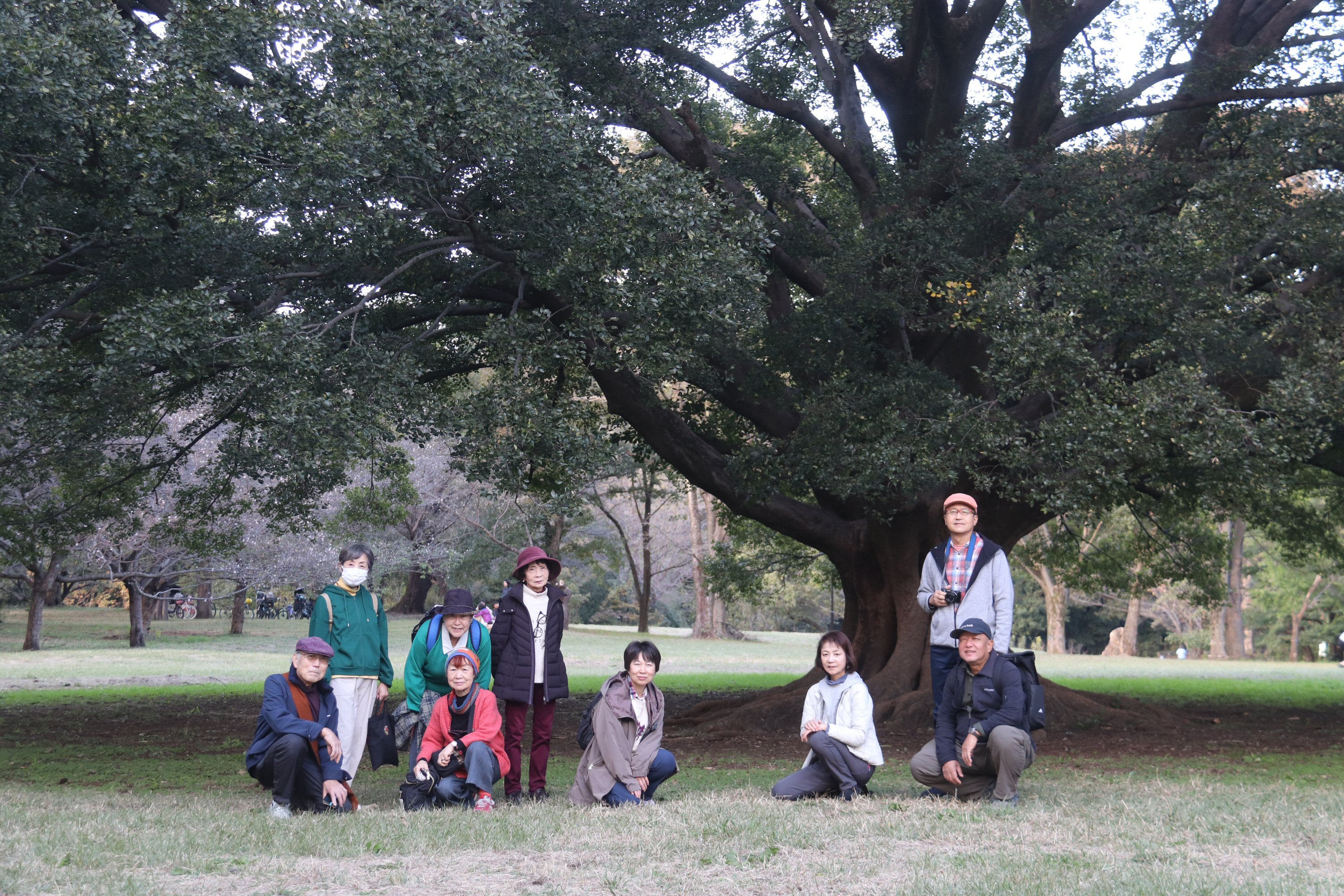 次の野川公園へ。こちらで小休止。大きなクスノキの近くで大野さんがお菓子持ってきていていただきました。