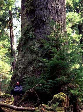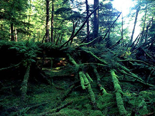 | そう、そこで人生が終わっても何の悔いも無いと思える場所なのだ。レッドシーダー、イエローシーダー、スプルース、島は一様に針葉樹の巨樹にあふれている。コケで覆われた地表は、どこに座ってもやわらかく、テントを張って横になると、大地のやさしさが体に染みわたる。 |